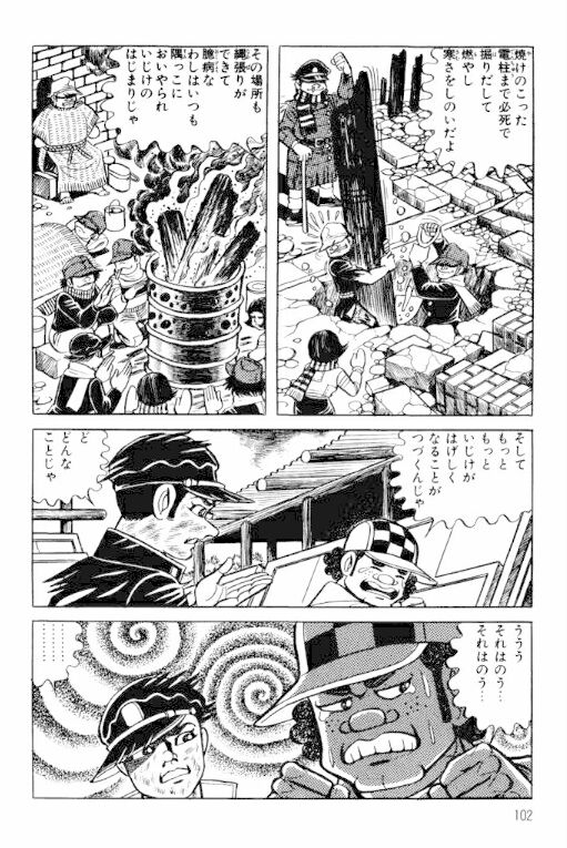 原爆投下後の広島でも同様の光景が見られたのだろうか。中沢啓治『はだしのゲン』でも電柱を掘り起こして薪にしているシーンが描写されていた。
